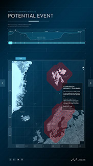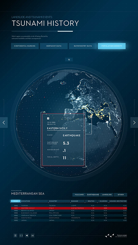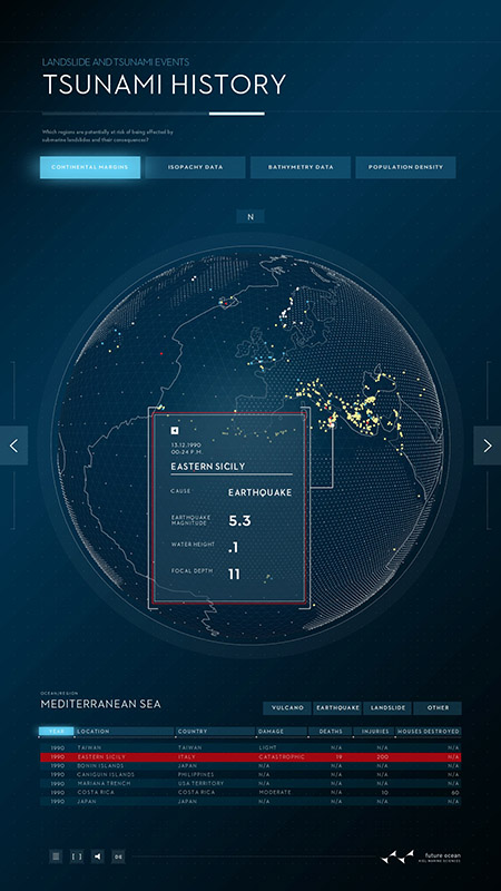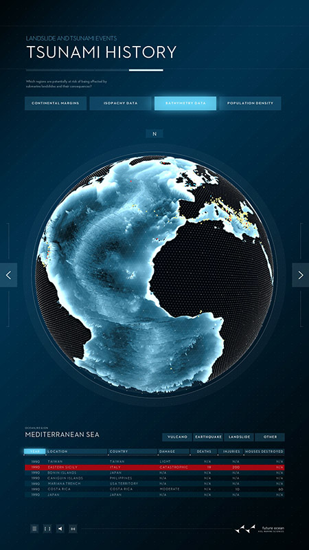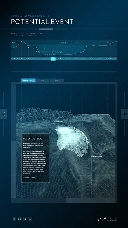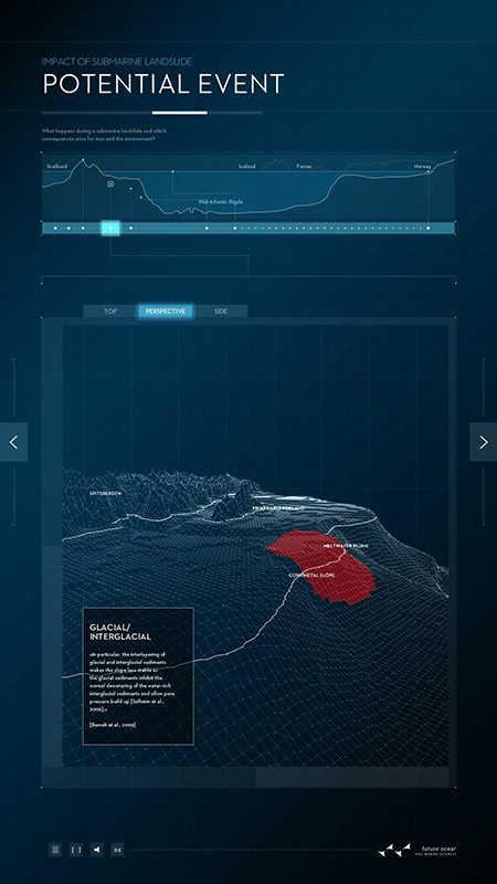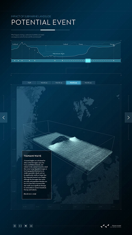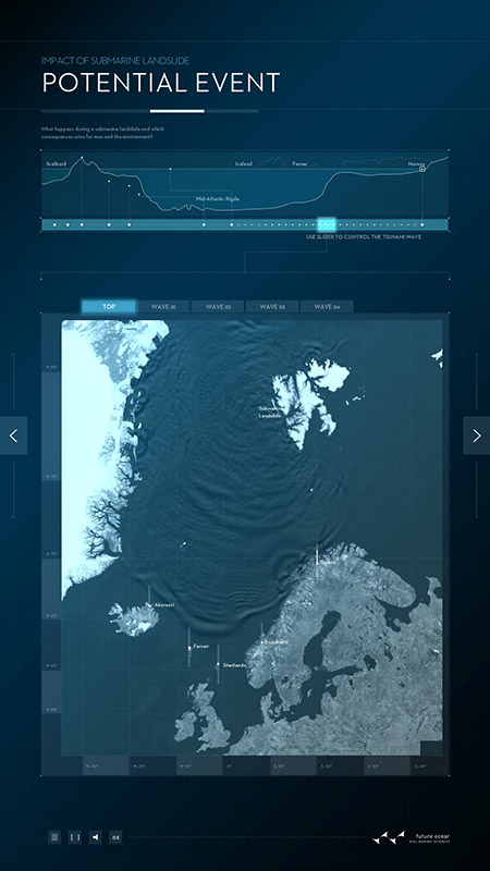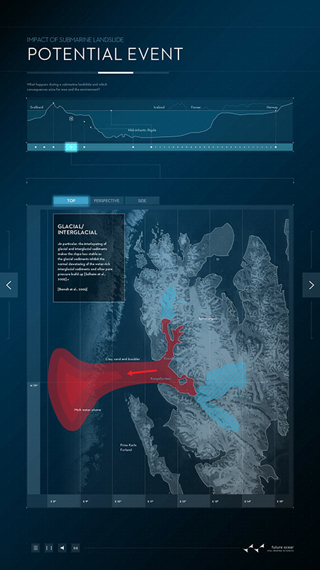 Schwerpunkt des ersten Posters ist die marine Geologie: Seebeben, submarine Hangrutschungen und die durch sie ausgelöste Tsunamis stellen nicht nur unmittelbar eine Gefahr dar. Sie haben das Potential, uns langfristig und im globalen Maßstab zu beeinflussen, wie die Beispiele von Sumatra 2004 und Japan 2011 belegen. Dargestellt wird unter anderem die Storegga-Erdrutschung: Durch Frank Schätzings Roman „Der Schwarm“ wurde sie auch außerhalb der Wissenschaft bekannt: Vor der Küste Norwegens hatte vor rund 8.000 Jahren ein Erdrutsch von der Größe Islands einen Tsunami ausgelöst und weite Teile Nordeuropas zerstört. Das digitale Poster vermittelt anschaulich die Ursachen, Mechanismen und Auswirkungen solcher Rutschungen und erklärt typische Situationen, die Hangrutschungen unter Wasser auslösen können. Mit dem interaktiven Poster wollen die Forschenden die Prozesse hinter größeren Hangrutschungen erklären und die wichtigsten Faktoren darstellen, die zu instabilen Hängen und damit zu Erdrutschungen unter Wasser führen. Die Untersuchung von „Gefahren aus dem Ozean (Dangerous Ocean)“ ist eines von insgesamt elf Forschungsfeldern im Exzellenzcluster „Ozean der Zukunft“.