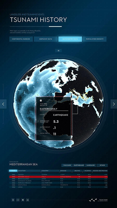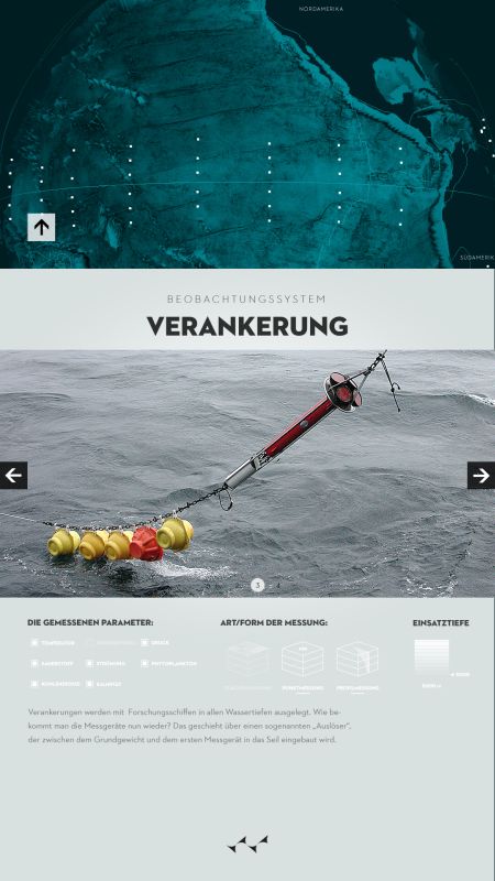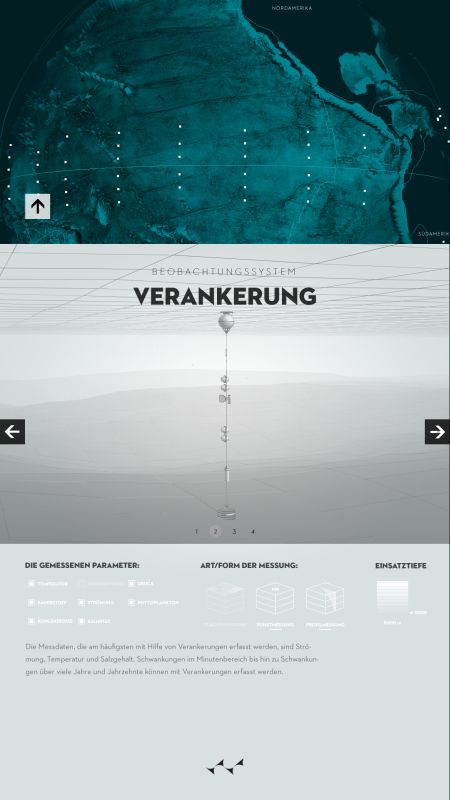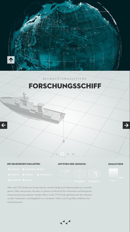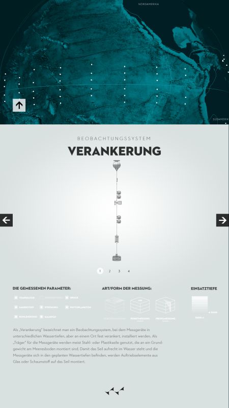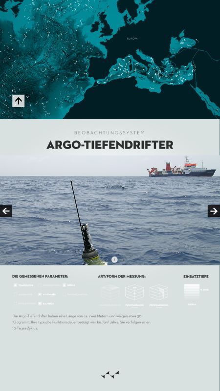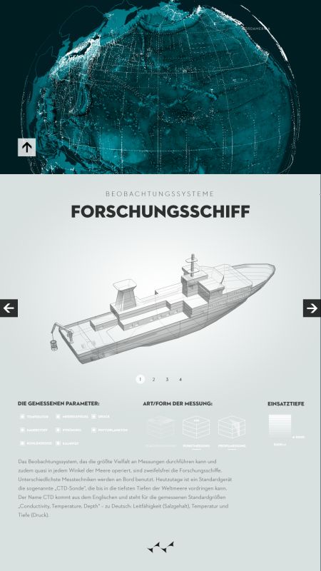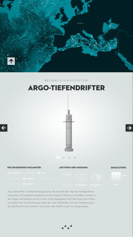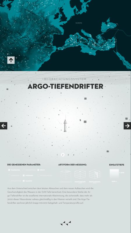 Durch die Visualisierung zeigt sich die deutliche Zunahme der Datendichte, ausgelöst durch modernisierte Aufnahmeverfahren und verstärktes wissenschaftliches Interesse. Die zunehmende Erwärmung der Weltmeere, auch als Reaktion auf globale Klimaveränderungen, wird zudem farblich veranschaulicht. Erhoben wurden die Daten mithilfe verschiedenster Verfahren, wie etwa Tiefendriftern (ARGO), Satelliten oder Messverfahren von Schiffen aus, über die der Nutzer sich mithilfe des digitalen Posters detailliert informieren kann.