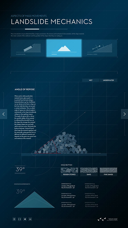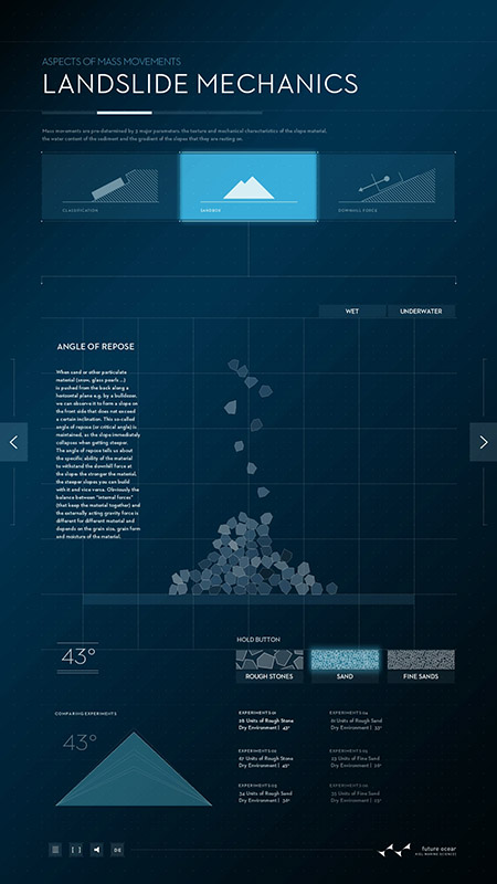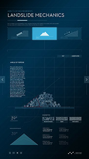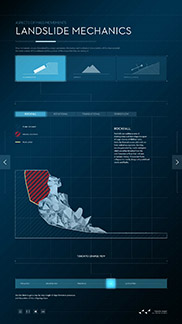 Welche Kräfte und Mechanismen sind während einer Hangrutschung von Bedeutung? Dies erfährt der Nutzer z.B., in dem Muster unterschiedlicher Rutschungen verglichen werden können. Anhand einer in Echtzeit berechneten Physik kann die Entstehung von natürlichen Böschungswinkeln unter unterschiedlichen Bedingungen nachvollzogen werden.