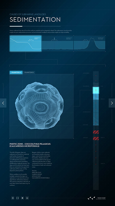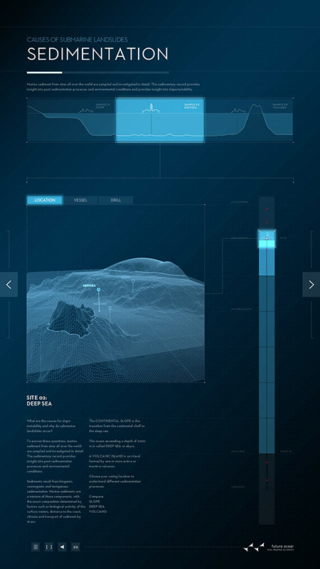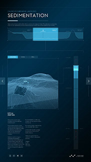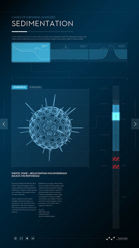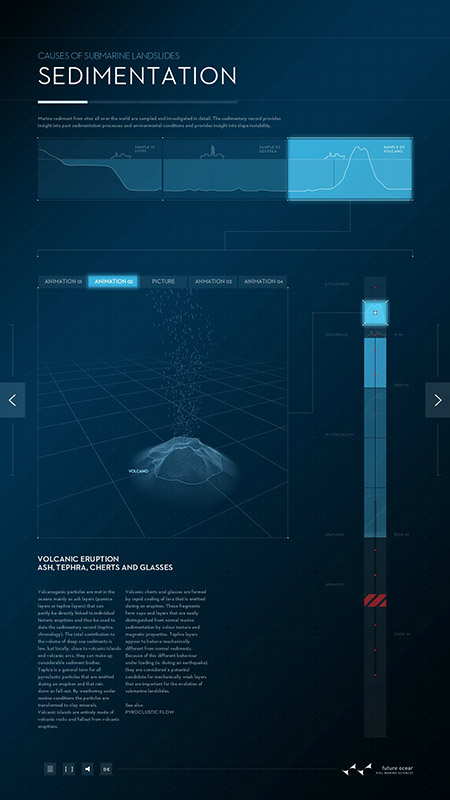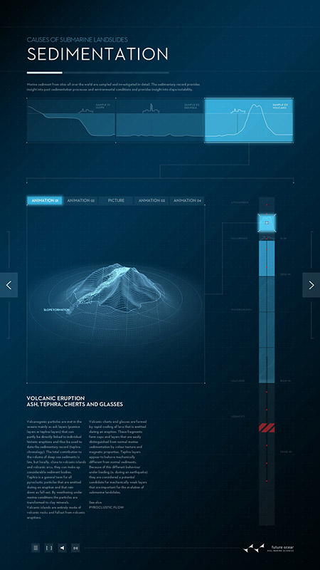 Ursache von Hanginstabilität und submarinen Hangrutschungen sind Sedimentationsprozesse, die zu teils inhomogenen und damit instabilen Sedimentschichten führen. Auf den Spuren der Wissenschaft erlaubt das Plakat dem Nutzer, unterschiedliche Sedimentationsprozesse an unterschiedlichen Orten des Ozeans zu untersuchen und zu verfolgen, zu welchen Sedimenten sie führen. Der Nutzer kann mit Hilfe eines vertikalen Sliders durch die Atmosphäre und Wassersäule mit einer Bohrung bis in die Sedimente eindringen. Animationen und Texte beschreiben die jeweils dort ablaufenden Prozesse.