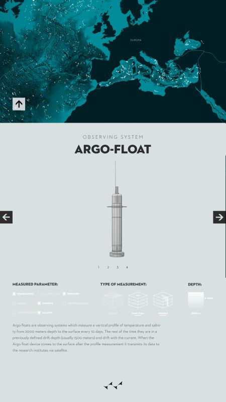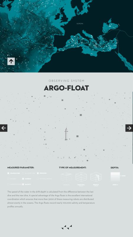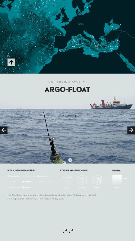 The clear increase in the density of data is shown by the visualization, triggered by modernized recording procedures and increased scientific interest. Moreover, the growing warming of the world's oceans, also as a reaction to global climate change is illustrated with colors. The data were gathered with the help of different procedures, such as floats (ARGO), satellites and measurement procedures on ships. The users can learn about this in more detail with the help of the digital poster.